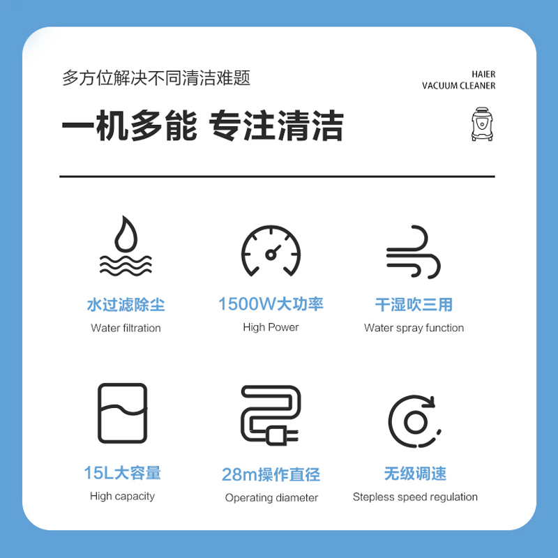 商品名称:海尔(Haier)桶式吸尘器家用水过滤干湿两用强大吸力吸尘器洗车店专用大功率吸尘机HZ-T5155B PULS