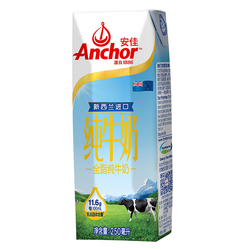 商品名称:安佳(Anchor)全脂纯牛奶 250ml*24盒/整箱 新西兰进口